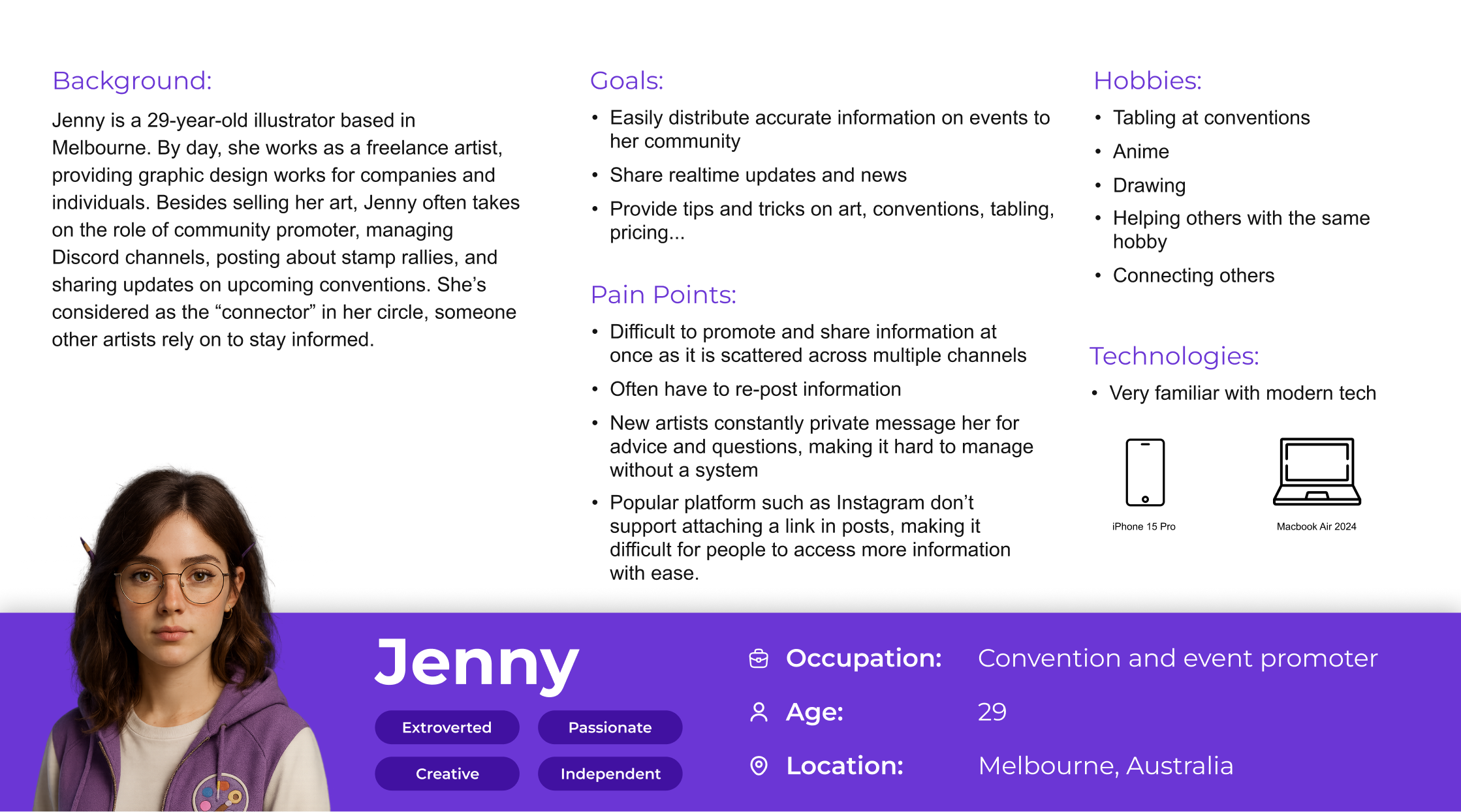 For my early concept, I created Jenny.ai, an app centered around an AI assistant designed to guide artists through the tabling process. Jenny.ai would provide up-to-date details on upcoming events, information on table applications, and tailored suggestions on topics such as printing, pricing, and travel preparation. The idea was to give artists, regardless of experience level, access to reliable information and on-demand support, similar to consulting an experienced artist. The assistant could also recommend local printing services with competitive pricing, helping users make informed, cost-effective decisions.